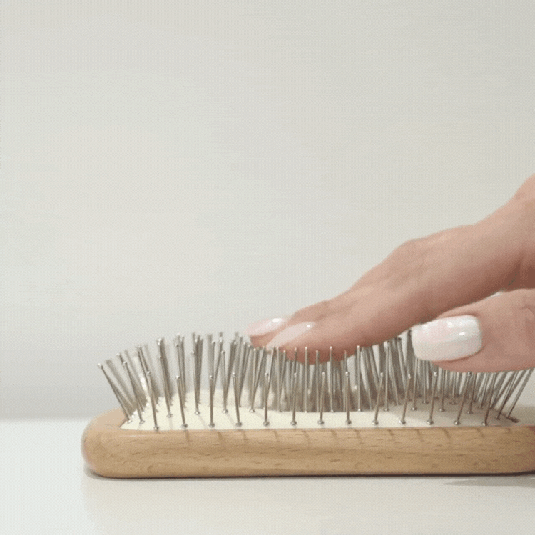 建議使用梳子清潔刷,可輕鬆將纏繞梳針的髮絲移除,並帶走氣墊上灰塵,亦可用扁梳清理髮絲,再搭配乾布擦拭氣墊部分。